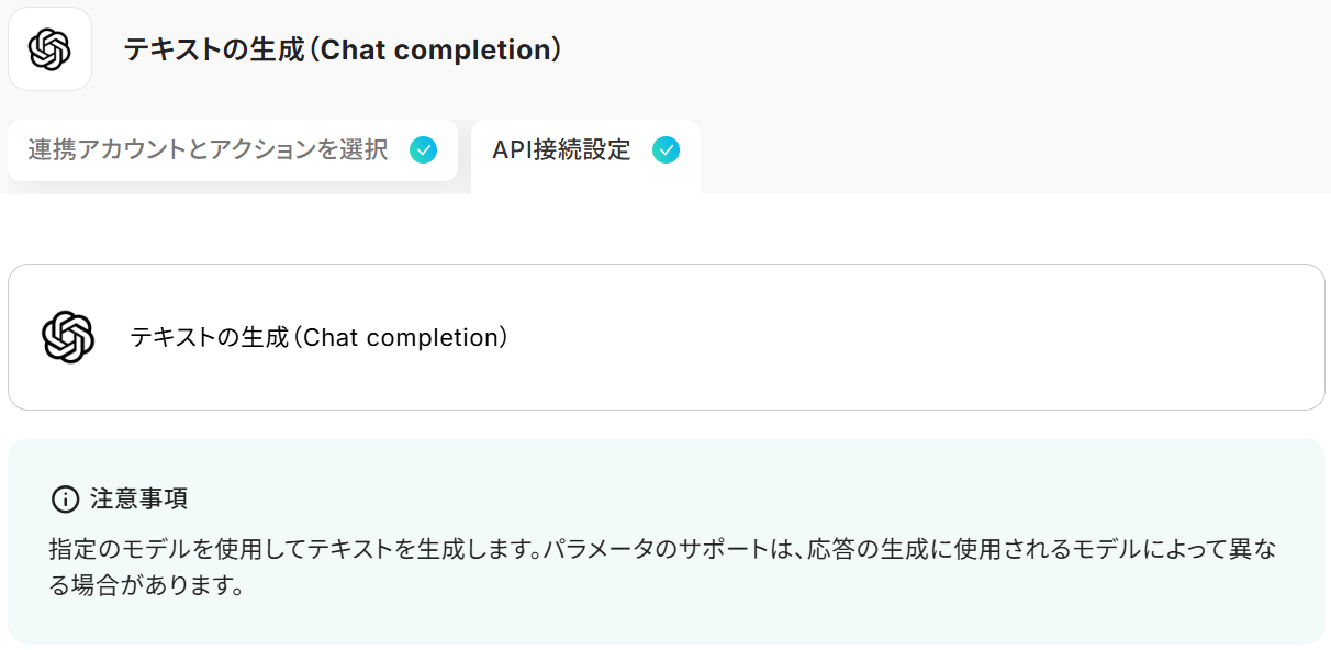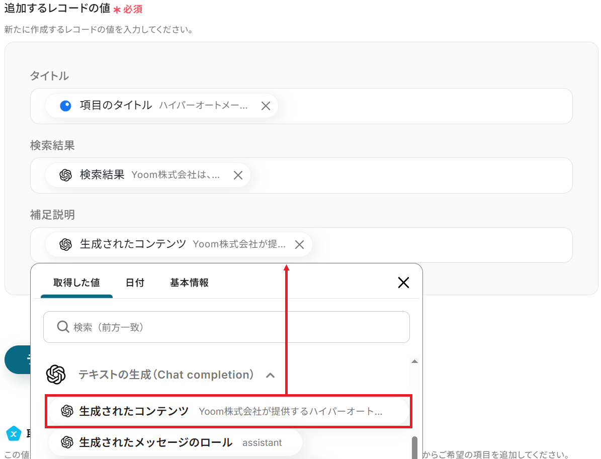 ステップ5:OpenAIでテキストを生成する設定 先ほどOpenAIが出力した検索結果に対し、補足説明を生成する設定をします。