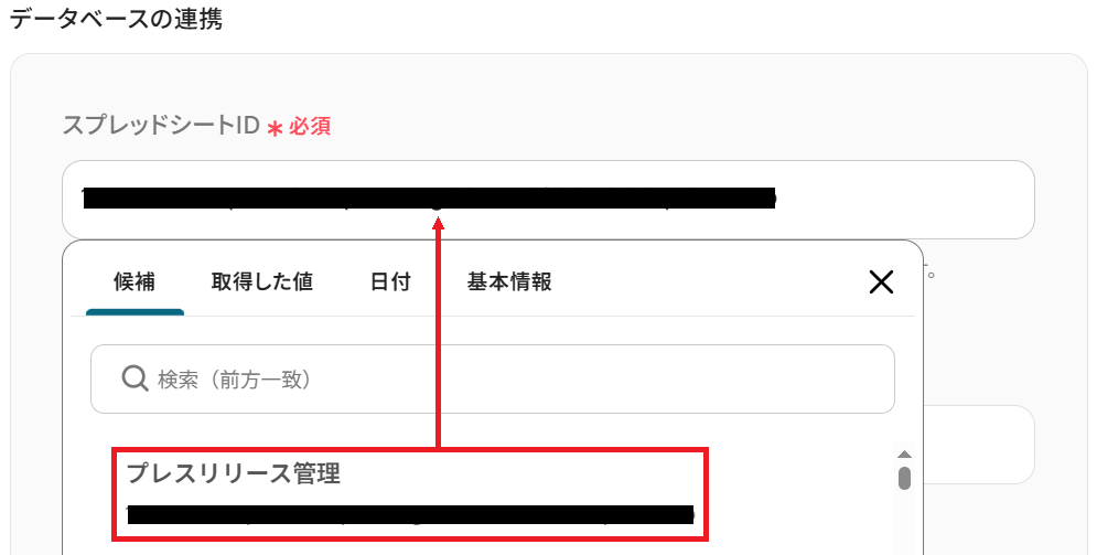 次に、先ほど用意したシートのスプレッドシートID を候補から選択しましょう。