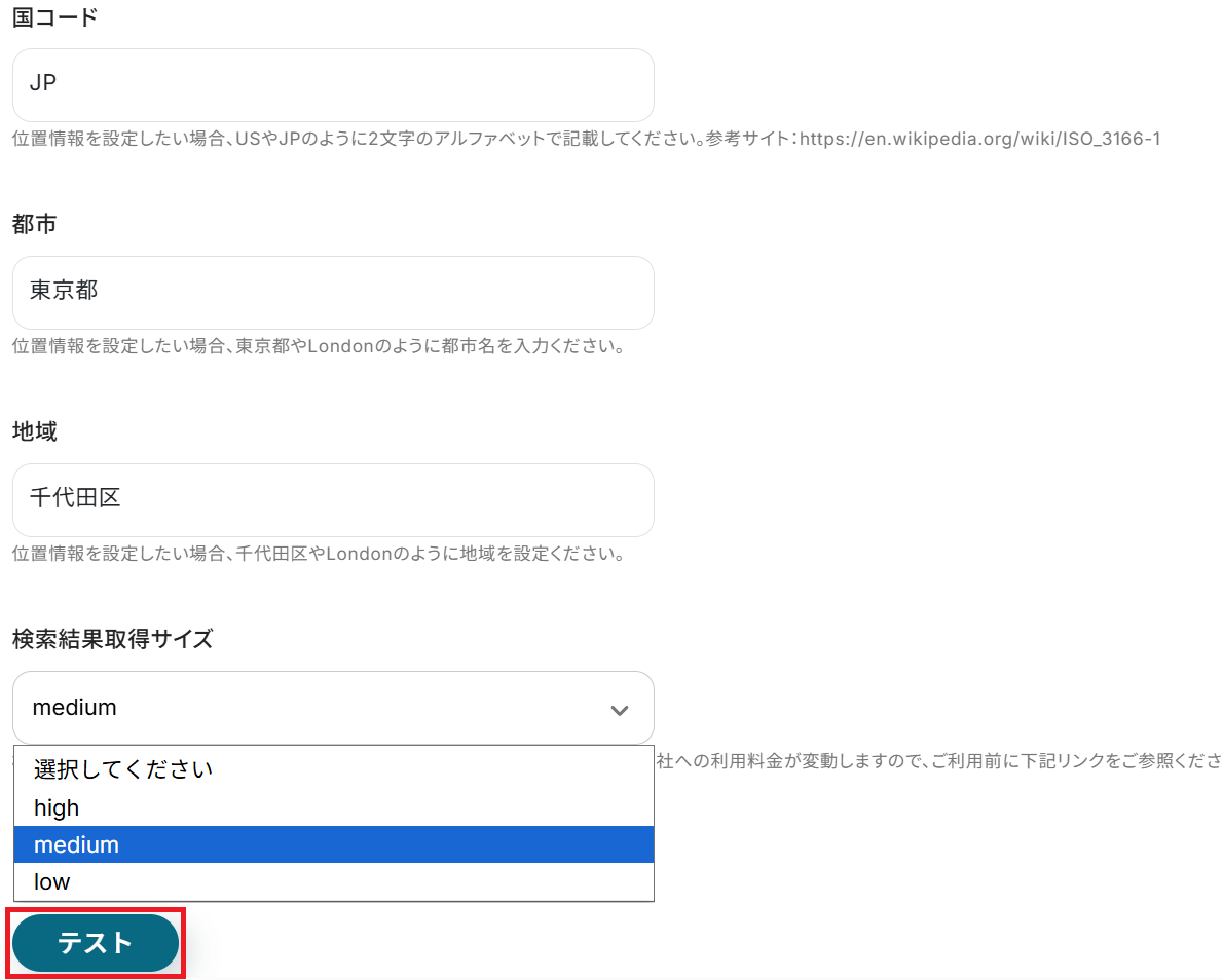 位置情報を付加したい場合は国コード ・都市 ・地域 をそれぞれ入力してください。 最後に、検索結果取得サイズ を任意で選択しテストしましょう。 ※サイズを変更することでOpenAI社への利用料金が変動しますので、利用前にPricing をご確認ください。