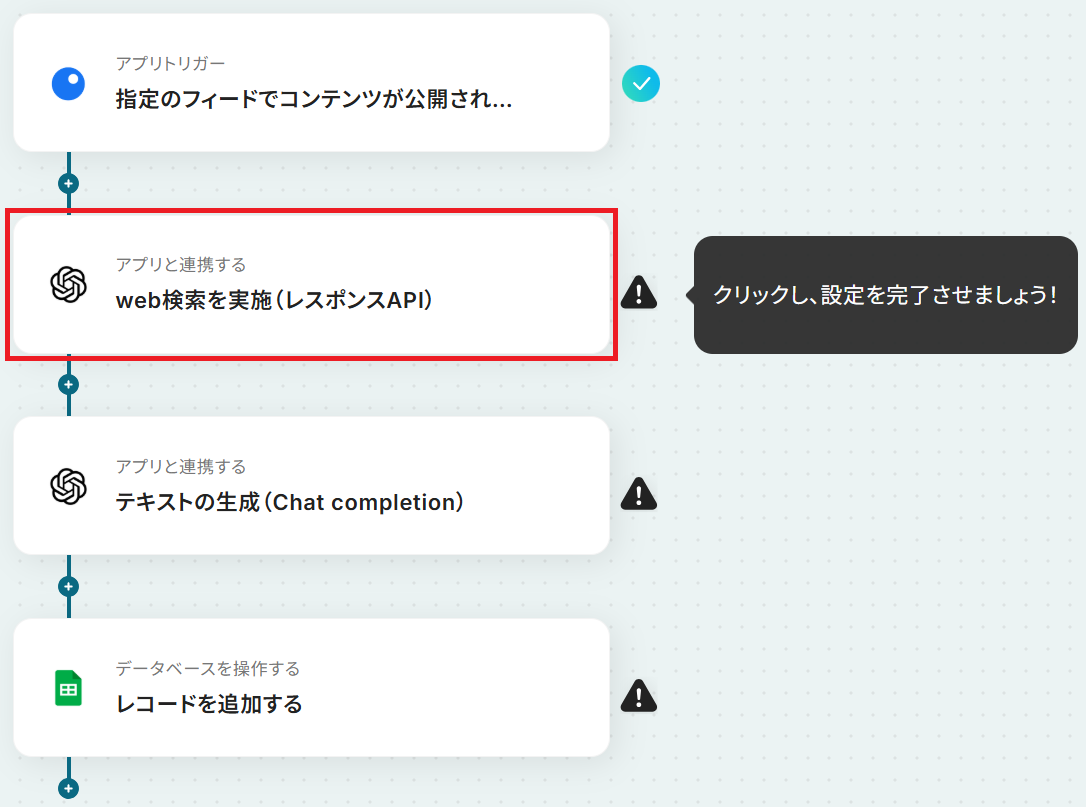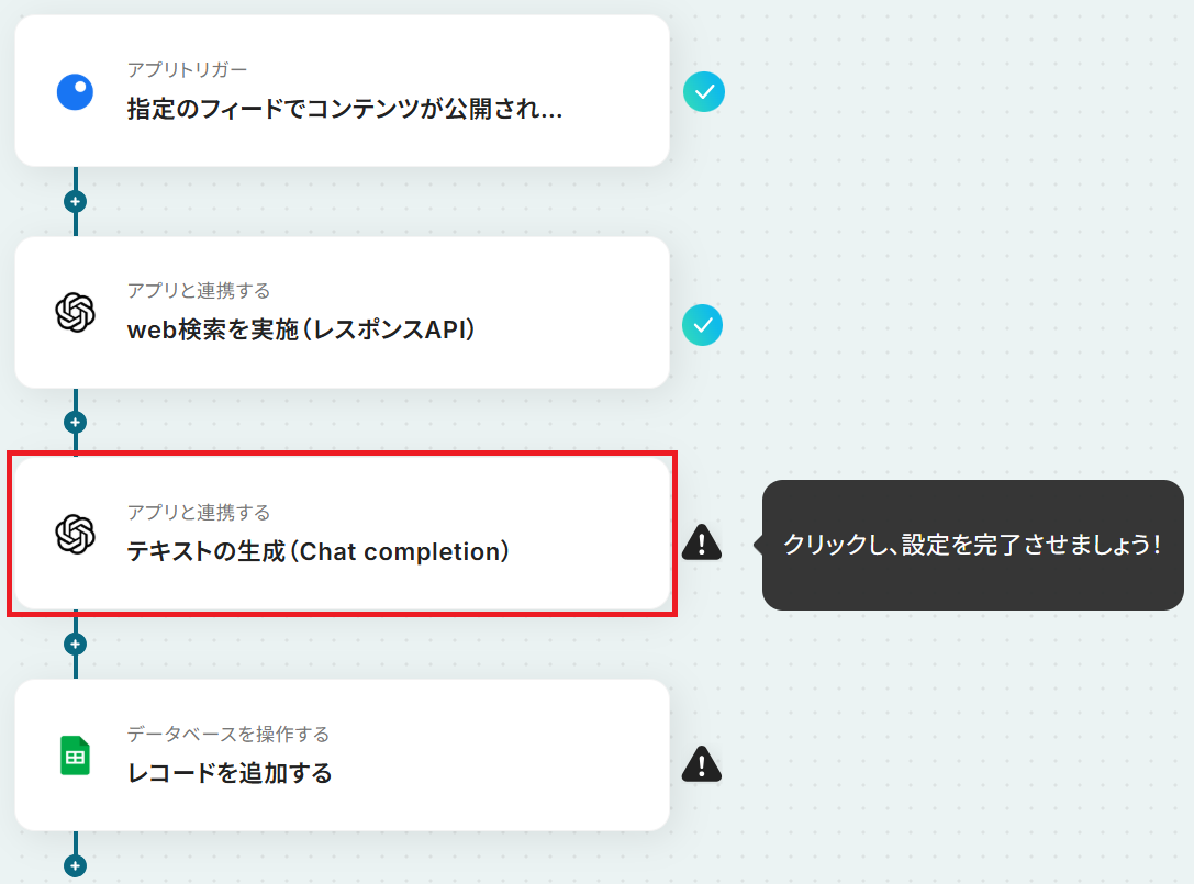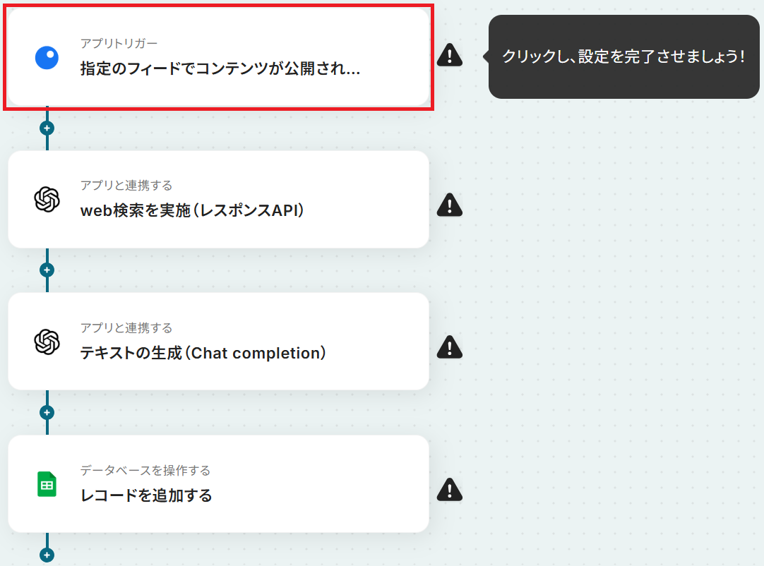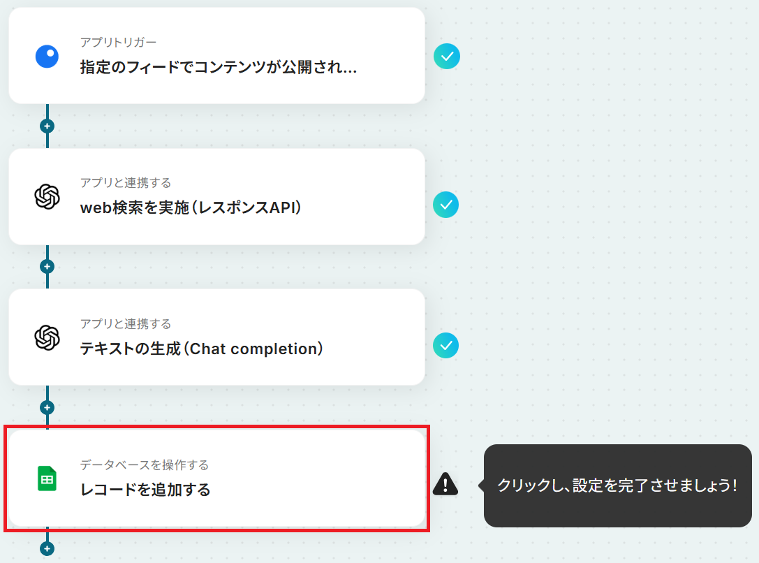 Inoreaderのトリガー設定では、情報収集の対象としたいフィードのURLを任意で設定してください。 OpenAIへの指示内容は、要約や翻訳、特定のフォーマットへの整形など、目的に応じて任意で設定可能です。 Google スプレッドシートにレコードを追加する際は、対象のスプレッドシートやシート、追加する内容を任意で設定してください。 ■注意事項