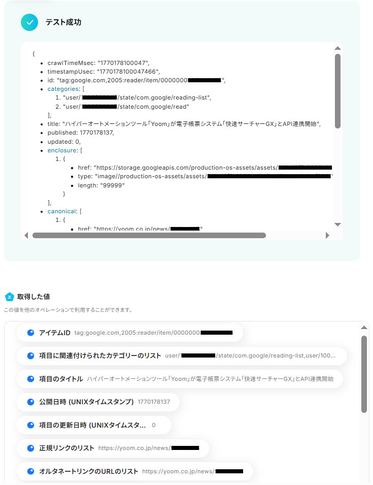 あとは先ほど用意したシートのヘッダーに対応する項目を選択してください。 InoreaderやOpenAIから取得した値を設定すると、変数として利用できます。 全ての項目を埋めたらテストしましょう。