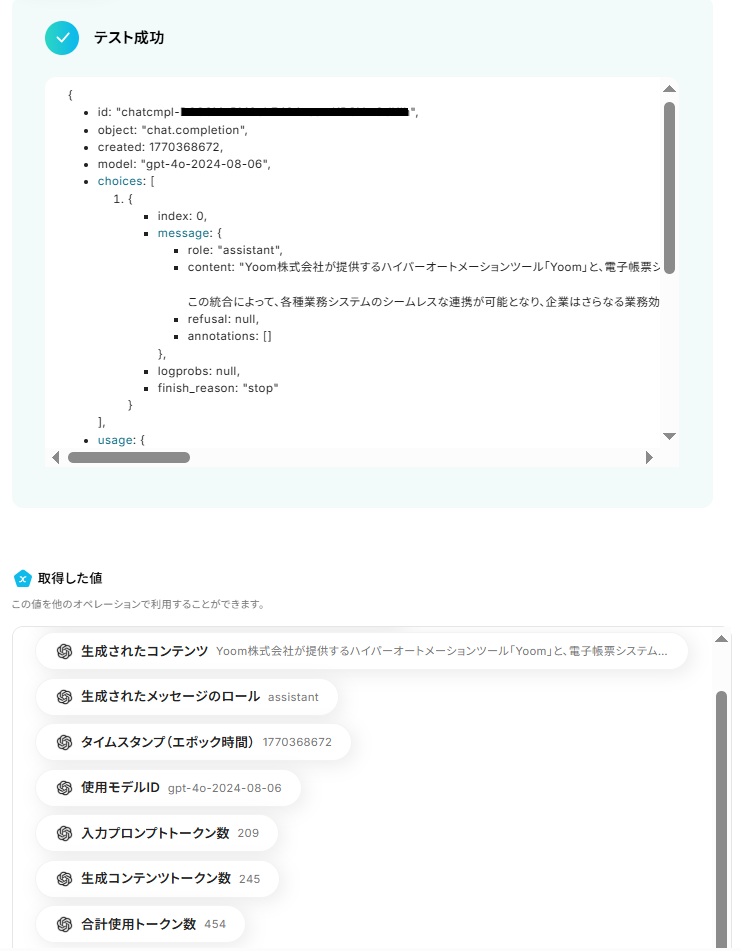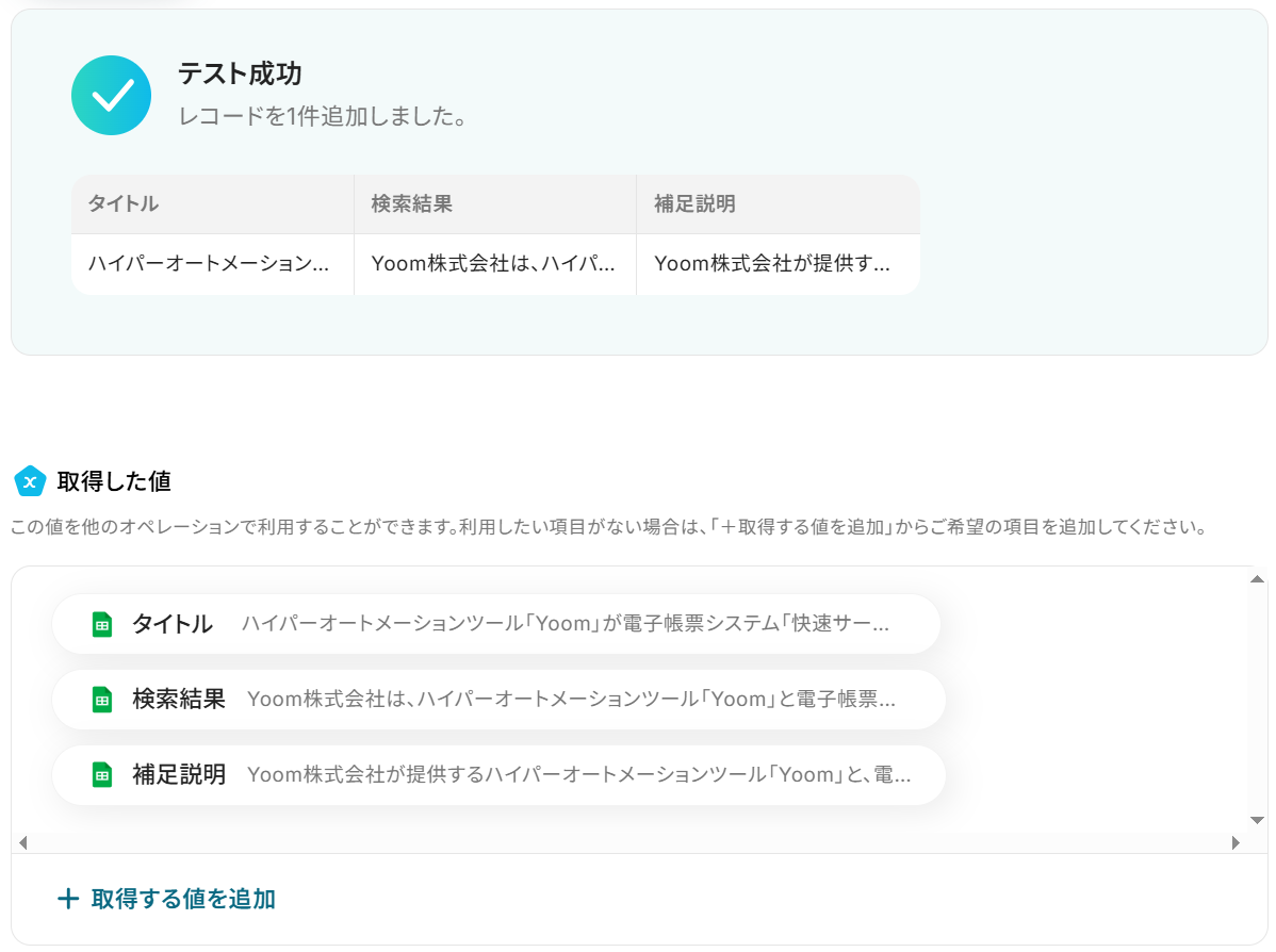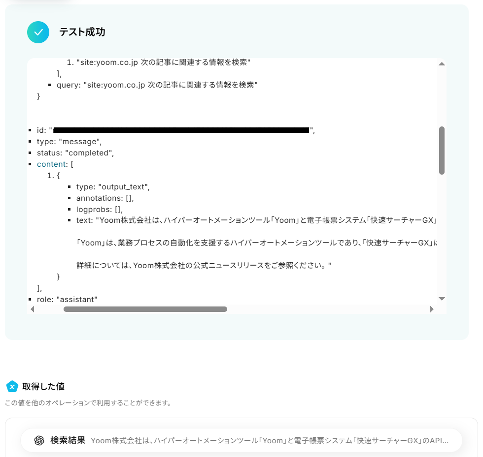 成功したら保存してください。ステップ4の検索結果に対し、OpenAIが補足説明を生成してくれました!