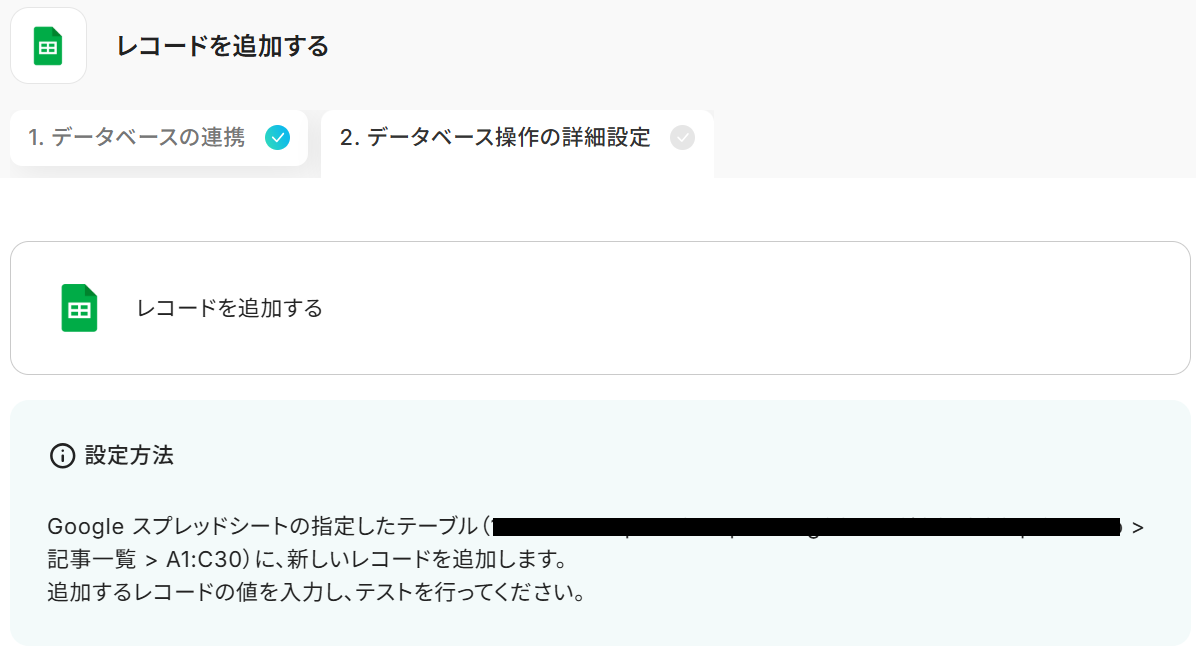 ステップ6:Google スプレッドシートのアクション設定 ステップ4・5で取得した検索結果および補足説明を、Google スプレッドシートに自動で記録する設定をします。