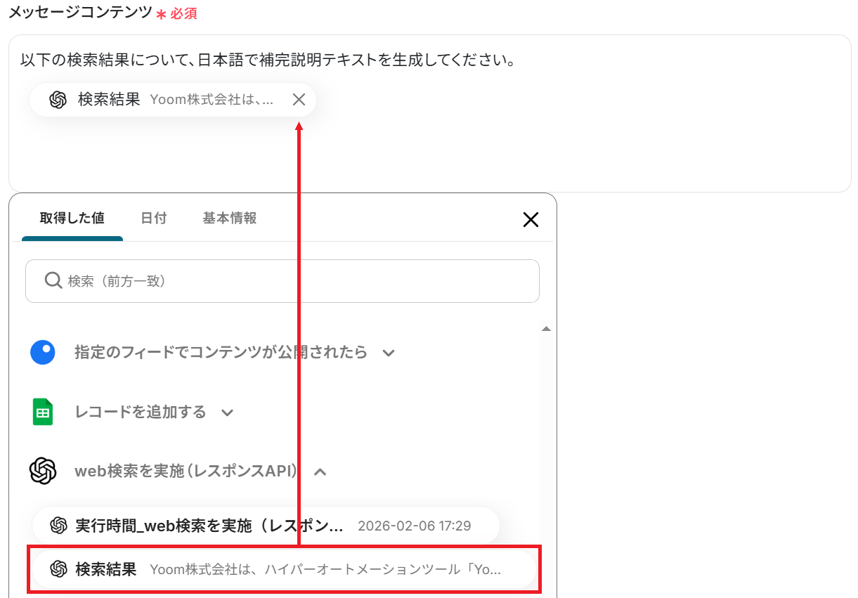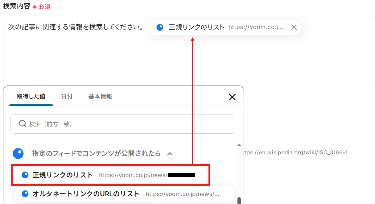 次に、Inoreaderから取得した「正規リンクのリスト」の値や固定の文章を組み合わせて、検索内容 (プロンプト)を入力しましょう。以下のように取得した値を設定することで、トリガーが実行されるたびに最新のコンテンツが反映されます。