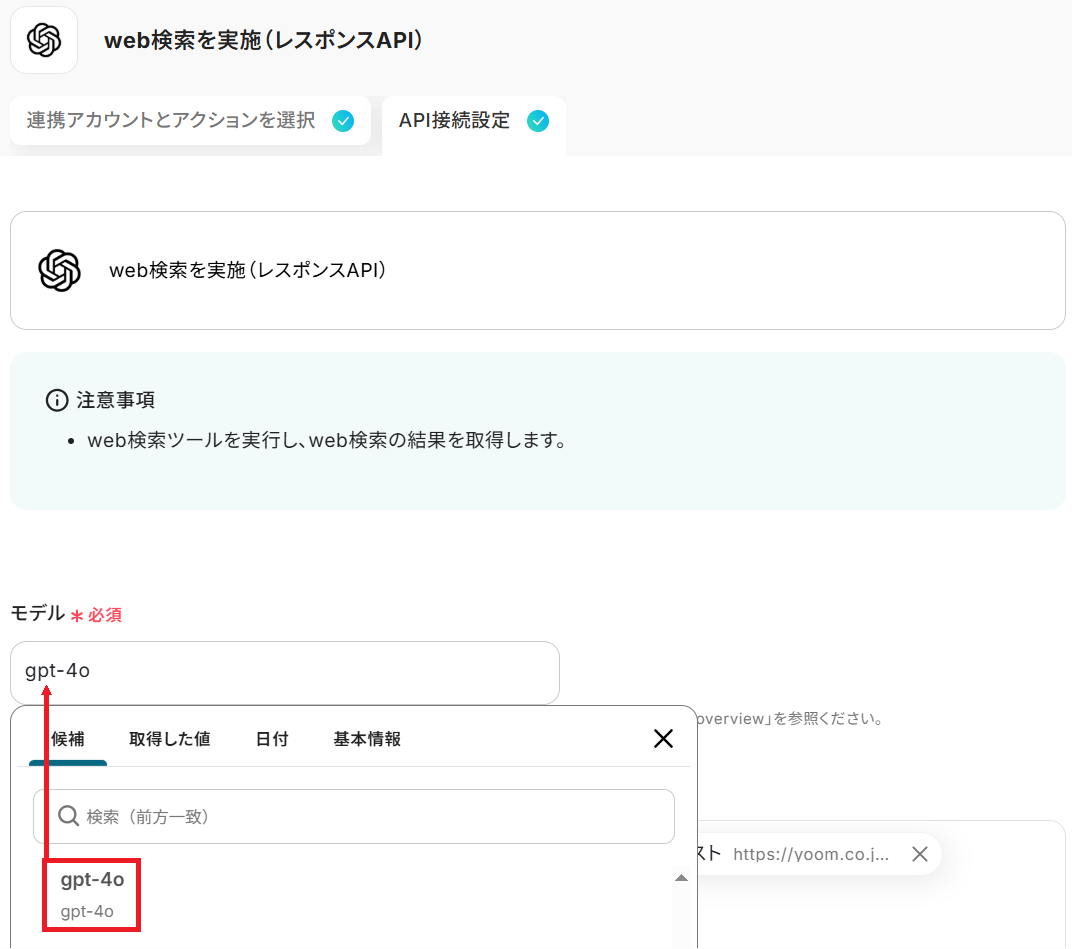 ステップ3と同様、アクションは「web検索を実施(レスポンスAPI)」のまま「次へ」をクリックします。