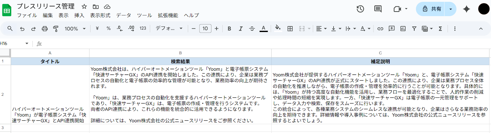 用意したシートに、検索結果および補足説明が自動で記録されました!