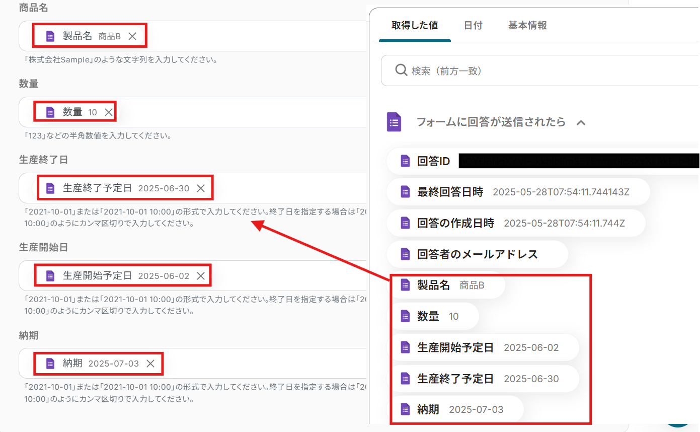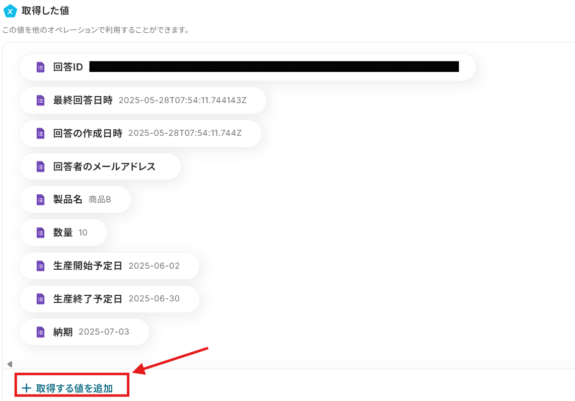 回答が足りない場合「取得する値を追加」をクリックし、ヘルプを参考に回答を取得してください。