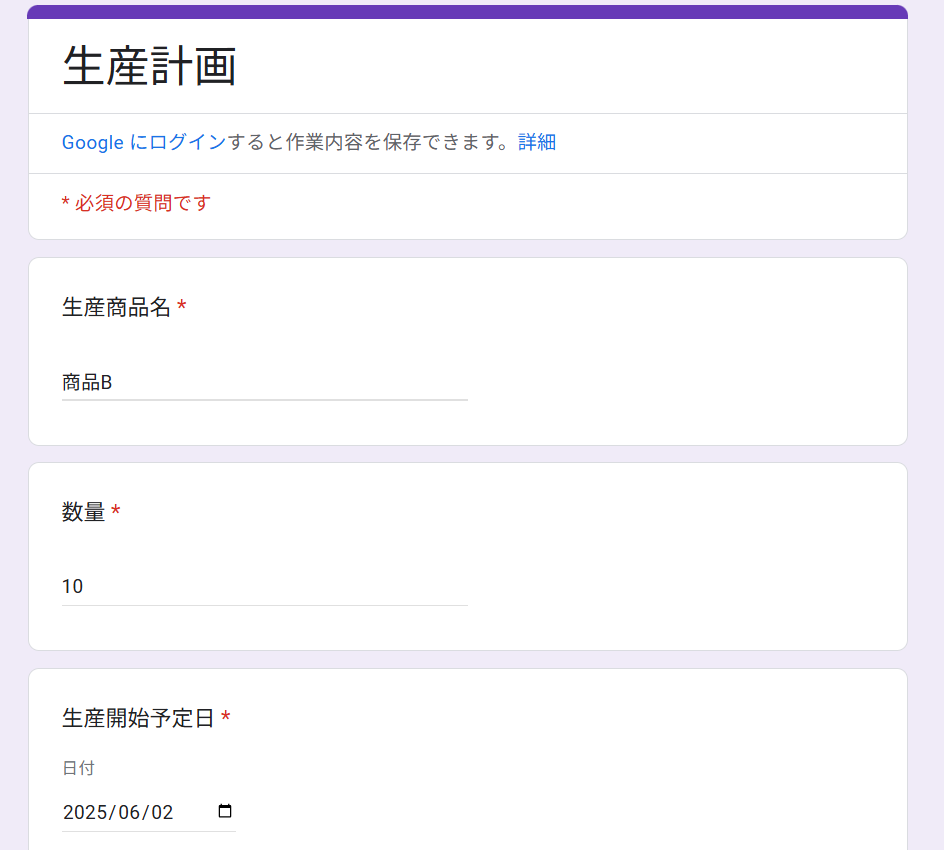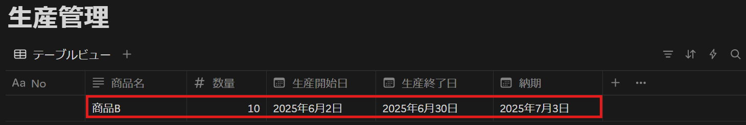 これですべての設定が完了したので、Googleフォームで生産計画の情報が送信されたら、Notionの管理ページに自動追加されるかを確認してみましょう。