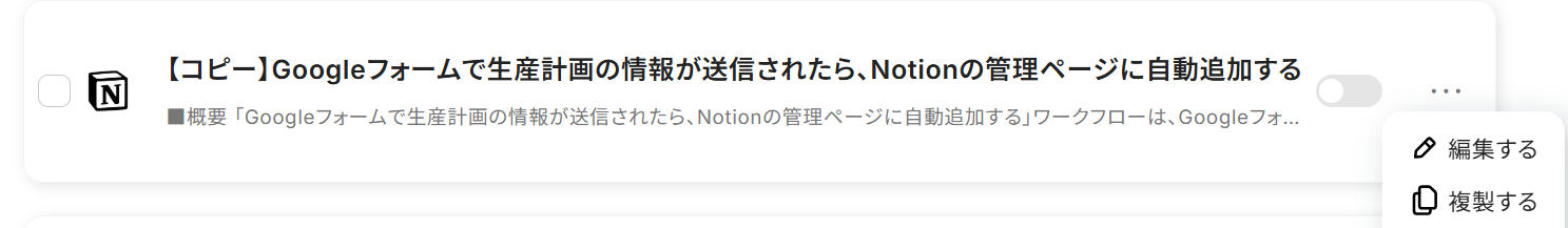 「Googleフォームで生産計画の情報が送信されたら、Notionの管理ページに自動追加する」ワークフローは、Googleフォームからの情報を自動でNotionに反映できます。