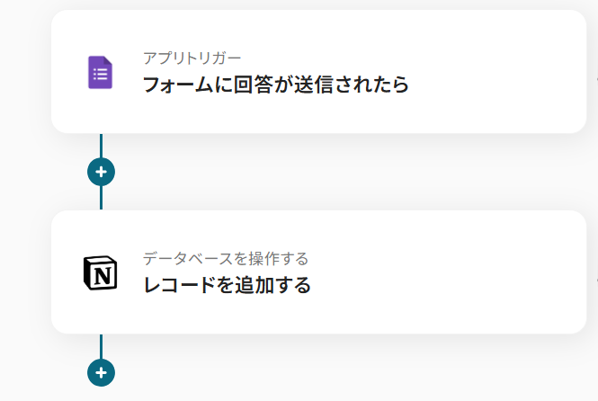 続いてフォームの回答をNotionに追加する設定を行うため、「レコードを追加する」をクリックします。