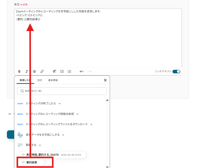 本文には、取得した値(アウトプット)を利用し、Zoomミーティングのトピックと、文字起こしした内容を入力しています。