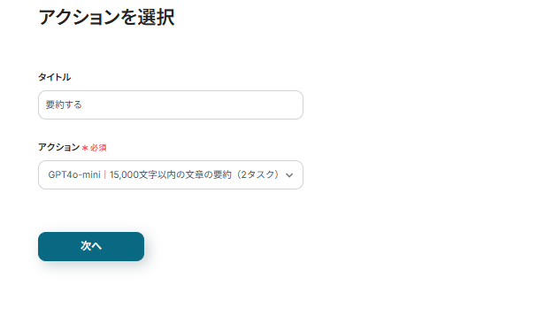 アクションを選択する画面は、設定の変更は必要ないためそのまま「次へ」をクリックしましょう。