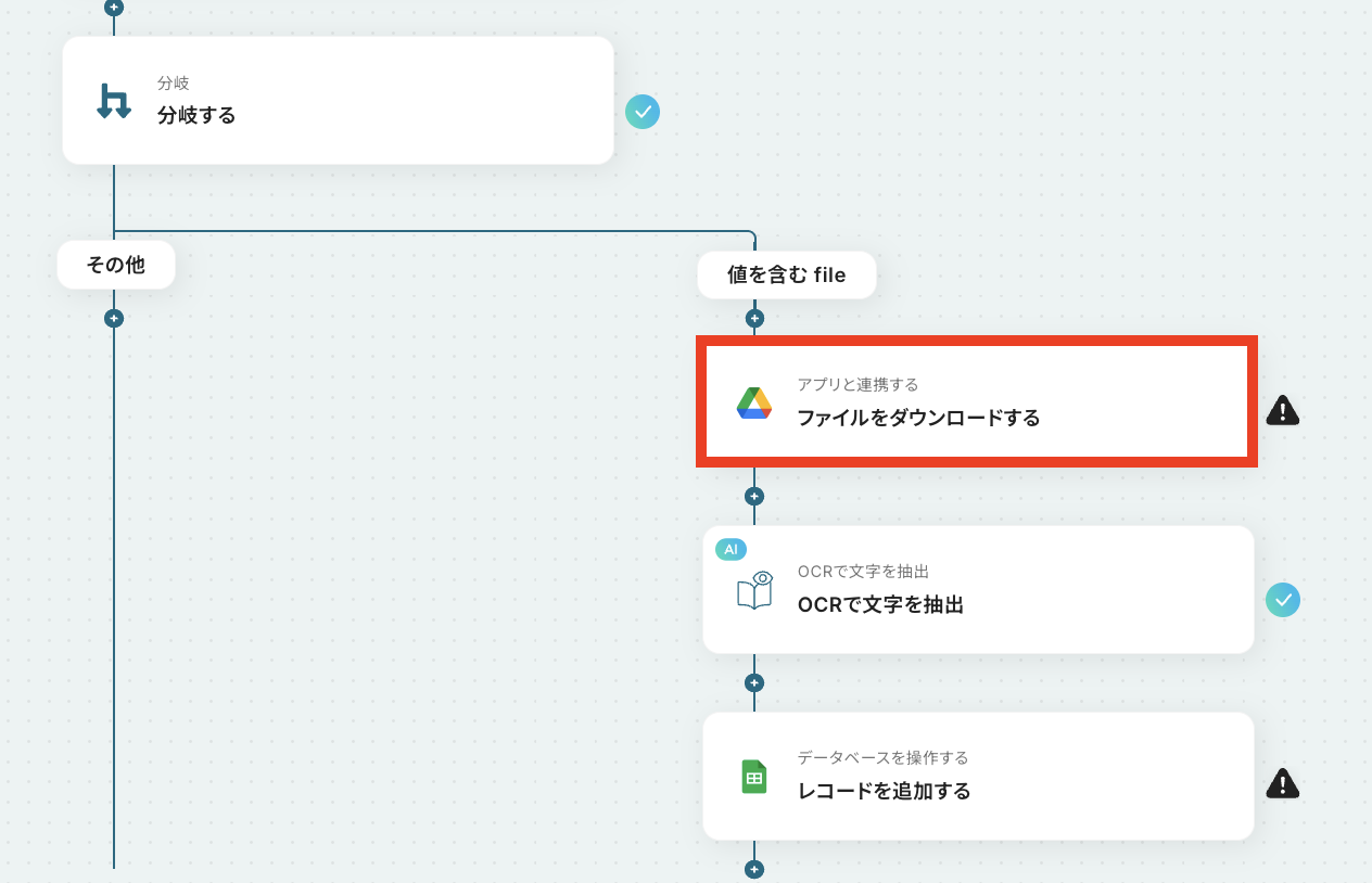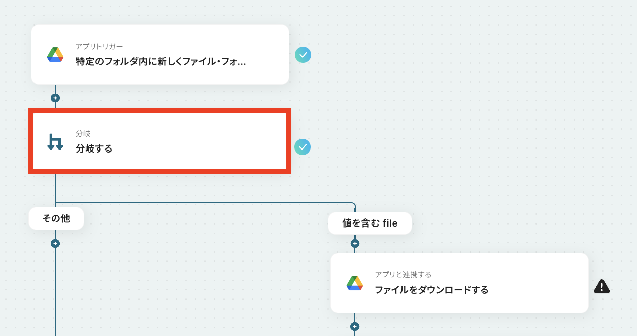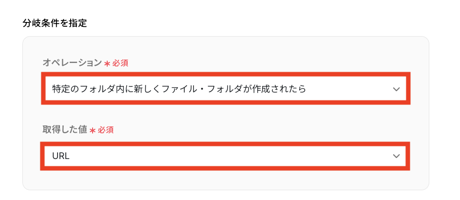 - ファイル名などに応じて処理を制御したい場合、分岐条件を任意で設定できます。例えば、特定のプロジェクト名のファイルのみを処理対象とすることが可能です。