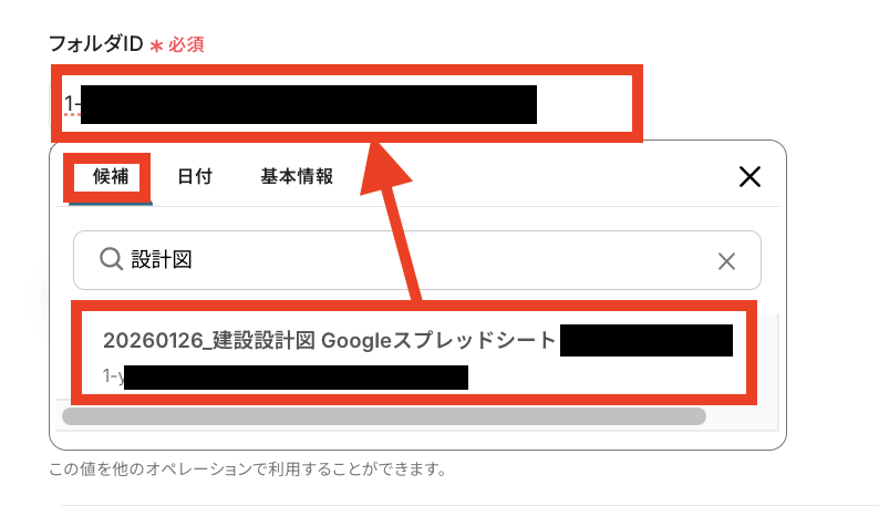 入力欄をクリックすると、候補一覧が表示されるので連携したいフォルダを選択します。