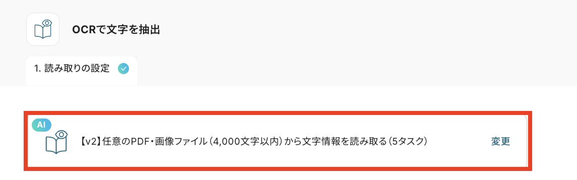 「アクション」はデフォルトで「任意のPDF・画像ファイル(4,000文字以内)から文字情報を読み取る(5タスク)」が選択されていますが自由に変更できるので、必要に応じて変更してください。
