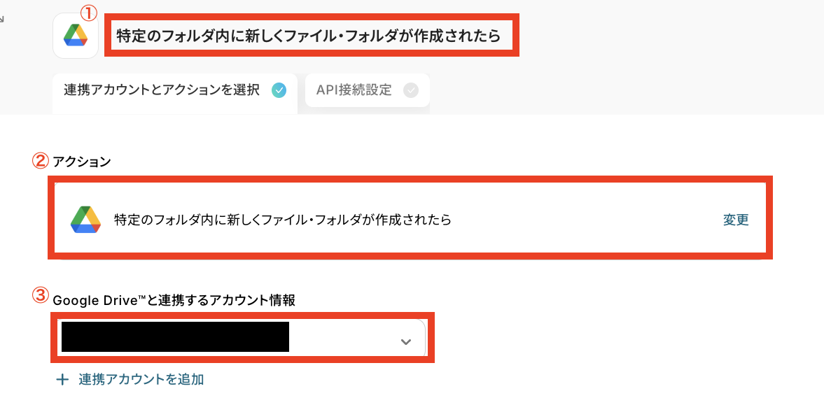 ②アクション:デフォルトで「特定のフォルダに新しくファイル・フォルダが作成されたら」が選択されているのでそのままで問題ありません!