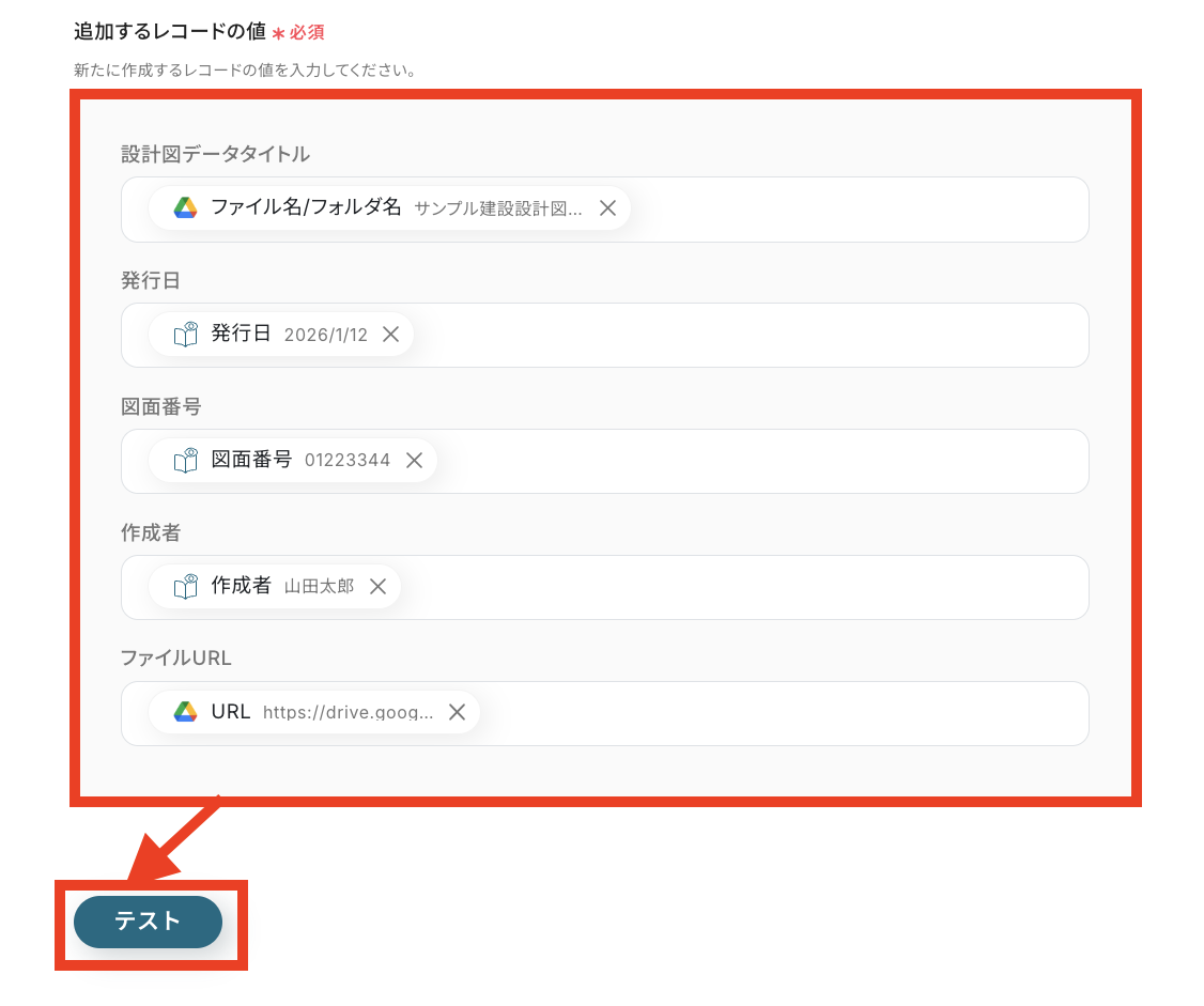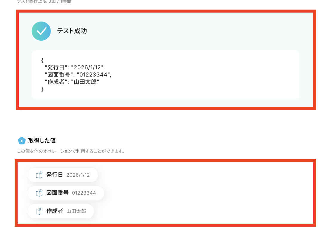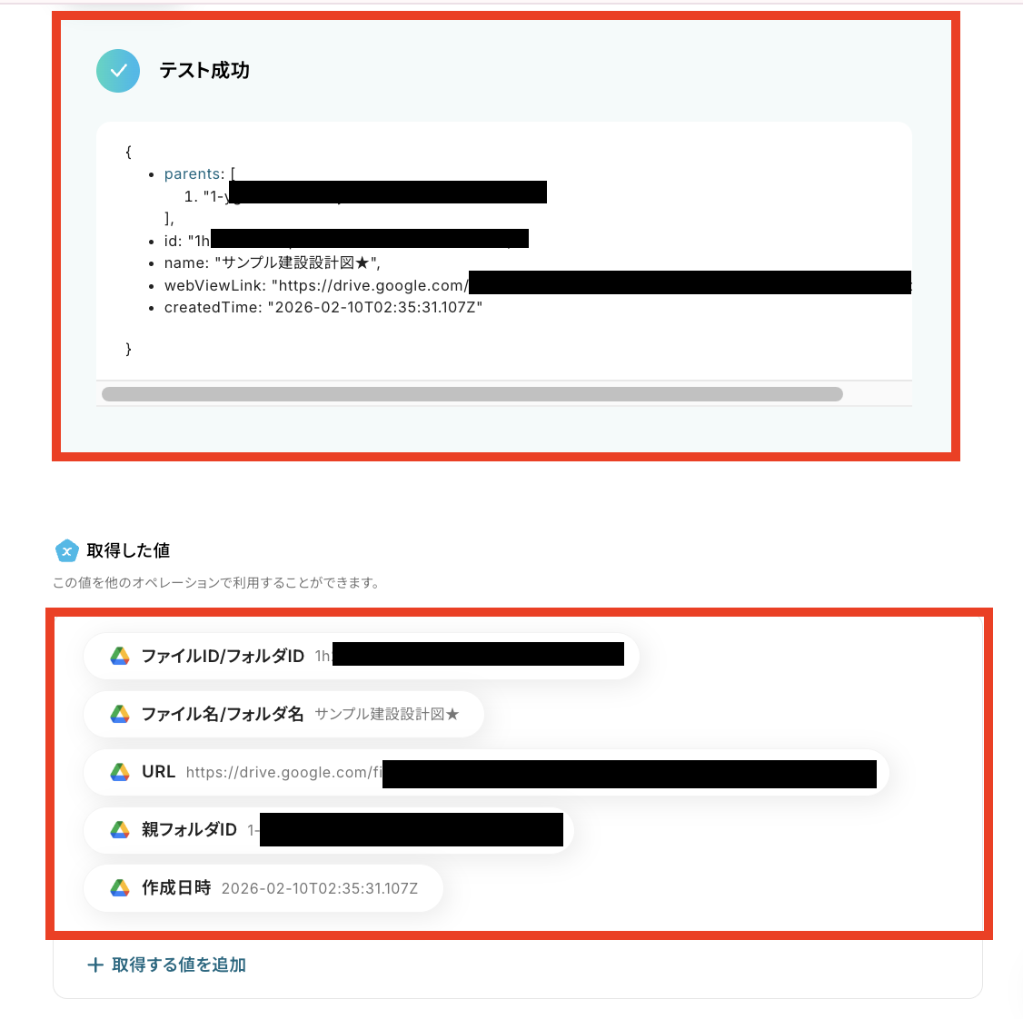 テストに成功すると、先ほど格納した建設設計図のデータが「取得した値(※)」の欄に反映されるので、確認できたら「完了」をクリックしてください。
