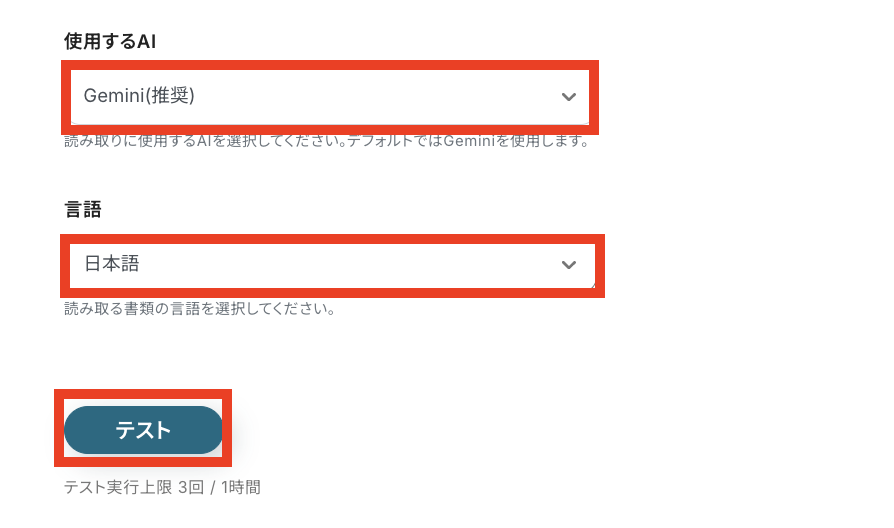 最後に「使用するAI」と「言語」を選択したら「テスト」をクリックします。