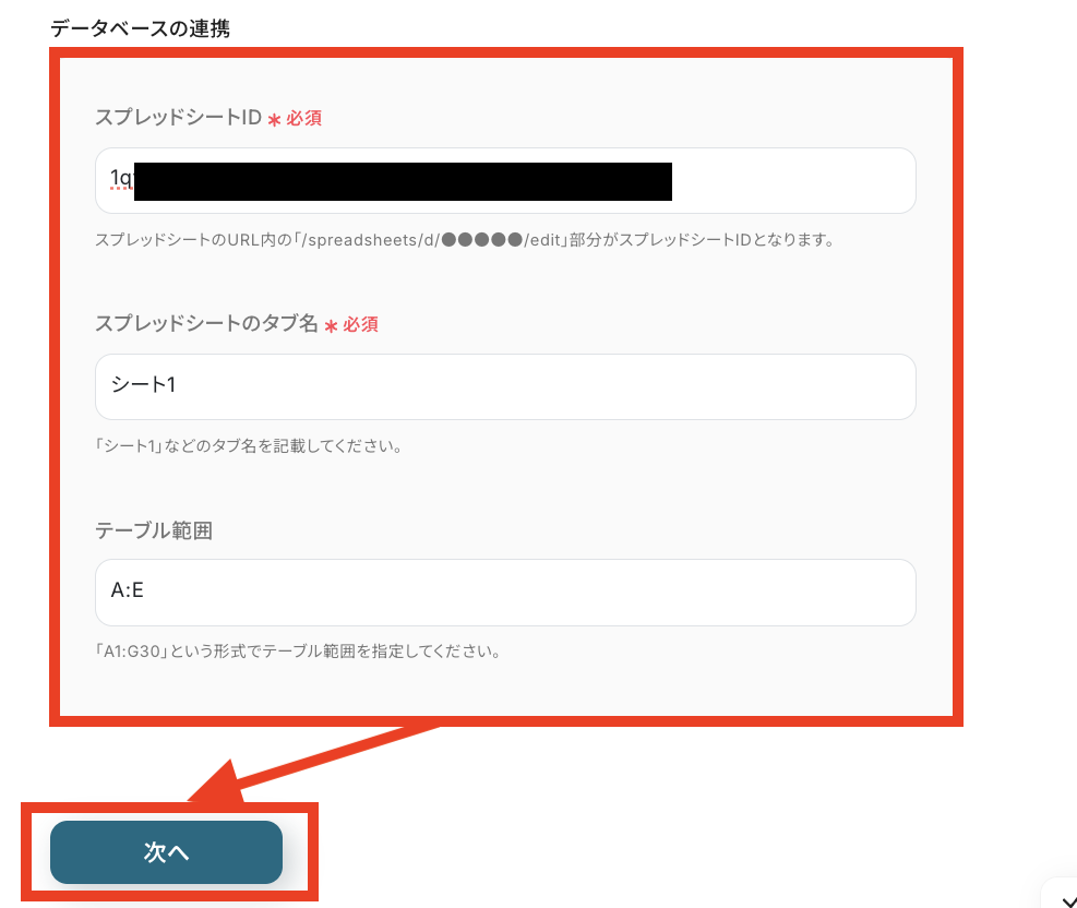 最後に「テーブル範囲」もGoogle スプレッドシートに合わせて設定できたら「次へ」をクリックしてください。