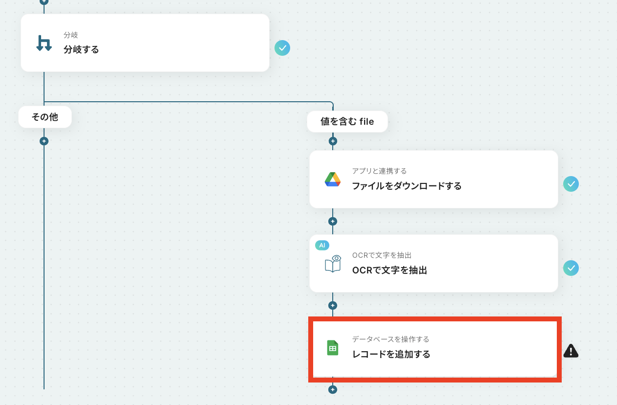 ※分岐はミニプラン以上のプランでご利用いただける機能(オペレーション)です。フリープランの場合は設定しているフローボットのオペレーションはエラーとなりますので、ご注意ください。