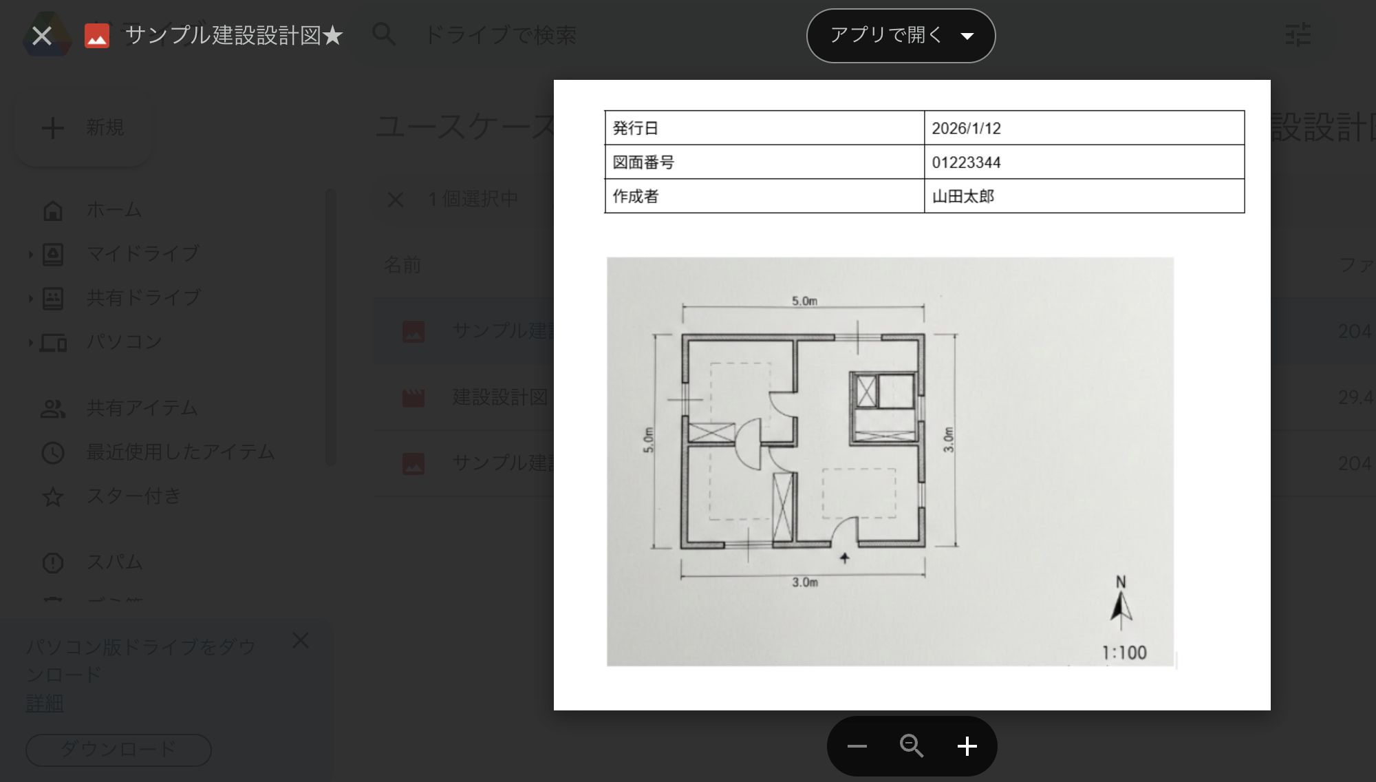 今回はテスト用に準備した建設設計図を連携したフォルダ内に格納しています!
