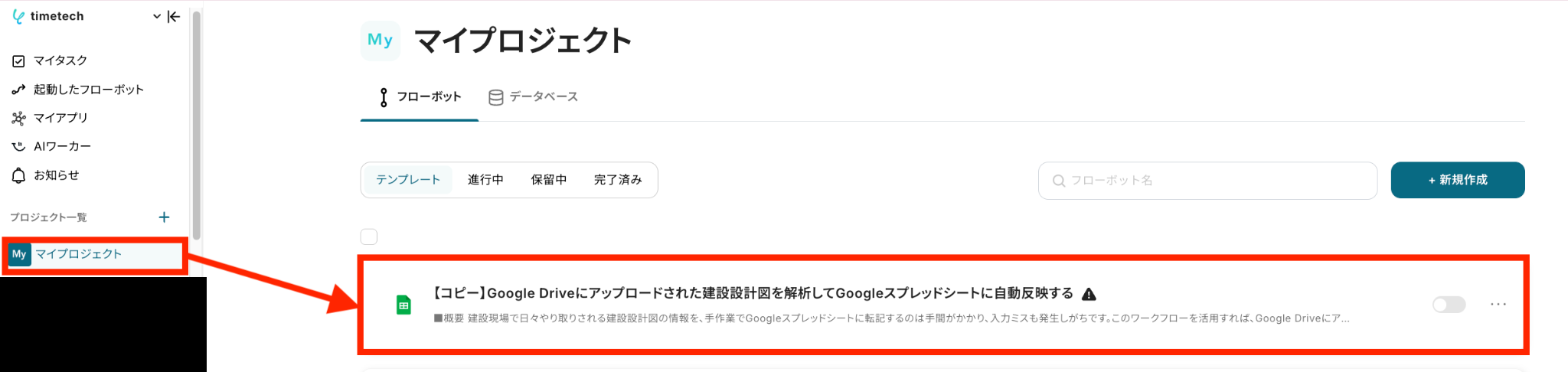 左側にあるメニューの「マイプロジェクト」から、コピーしたテンプレートを開きます。