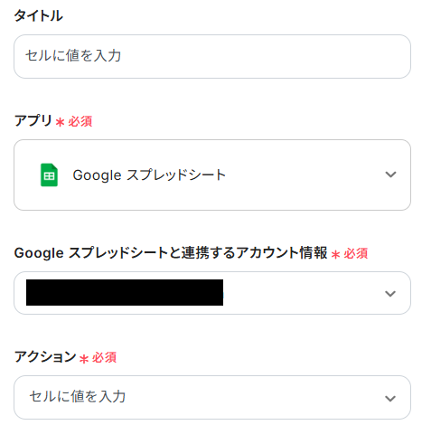 アクションは、テンプレート通りに「セルに値を入力」のままで大丈夫です。
