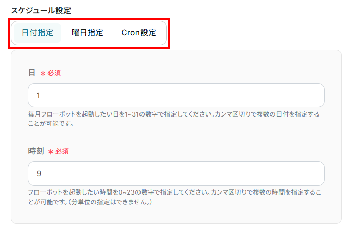 「スケジュール設定」は、下記赤枠のタブを選択することで日付や曜日をトリガーとして設定することが出来ます。トリガーを起動したいタイミングをお好みで設定してください。