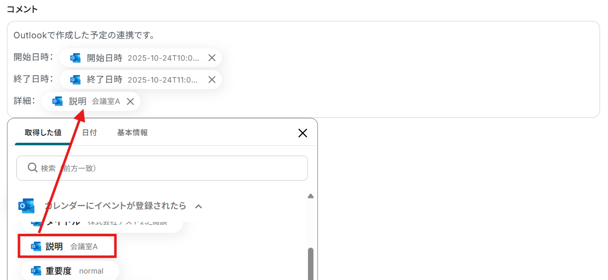 固定値部分:「Outlookで作成した予定の連携です。」「開始日時:」「終了日時:」「詳細:」