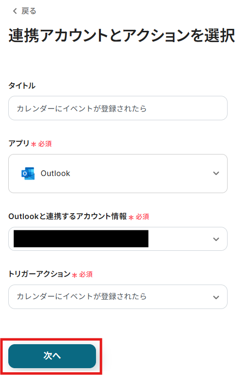 トリガーアクションは、「カレンダーにイベントが登録されたら」のままで次に進みましょう!