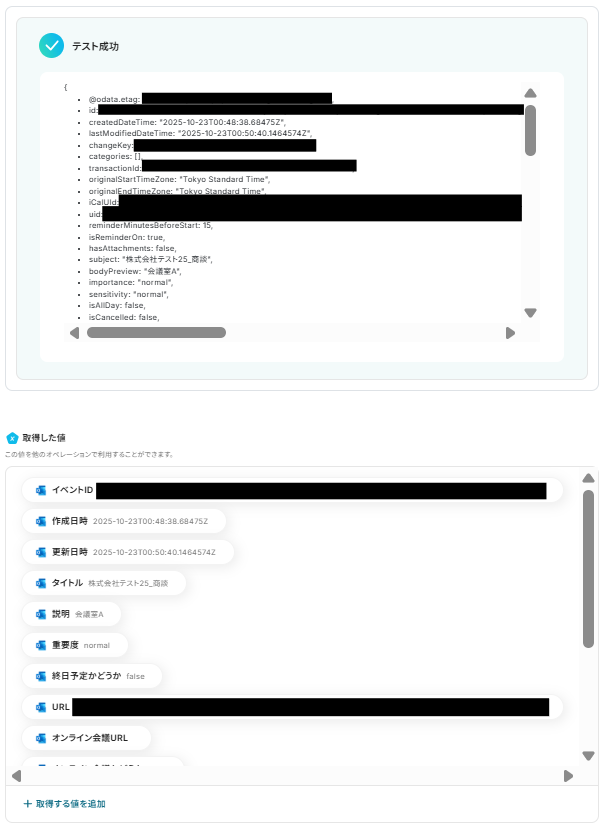 テストが成功すると取得した値の横に、Outlookで作成した予定の詳細情報が表示されます。