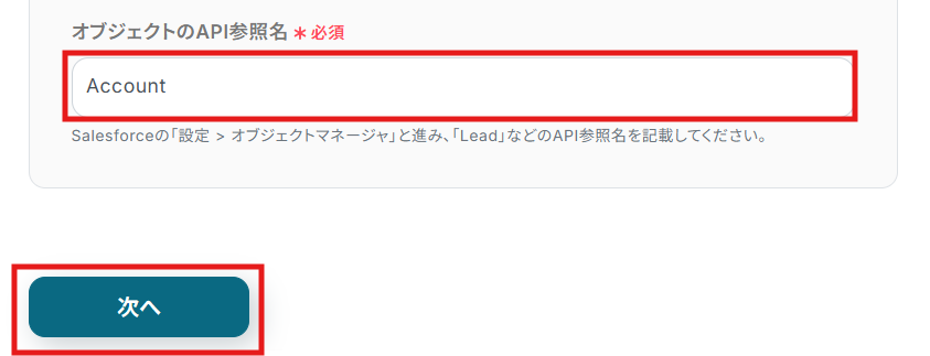 Yoomの操作画面に戻り、コピーしたAPI参照名を貼り付けて「次へ」をクリックします。