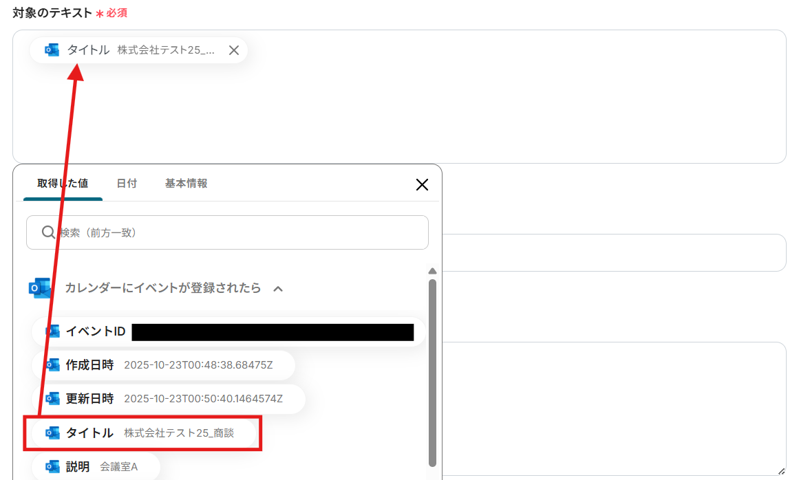次に、Outlookで作成した予定からテキストを抽出する設定を行います。