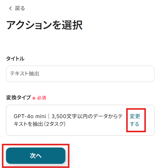 テキストを抽出する際に使用するGPTの種類は、あらかじめテンプレートで設定されているのでこのままで問題ありません。