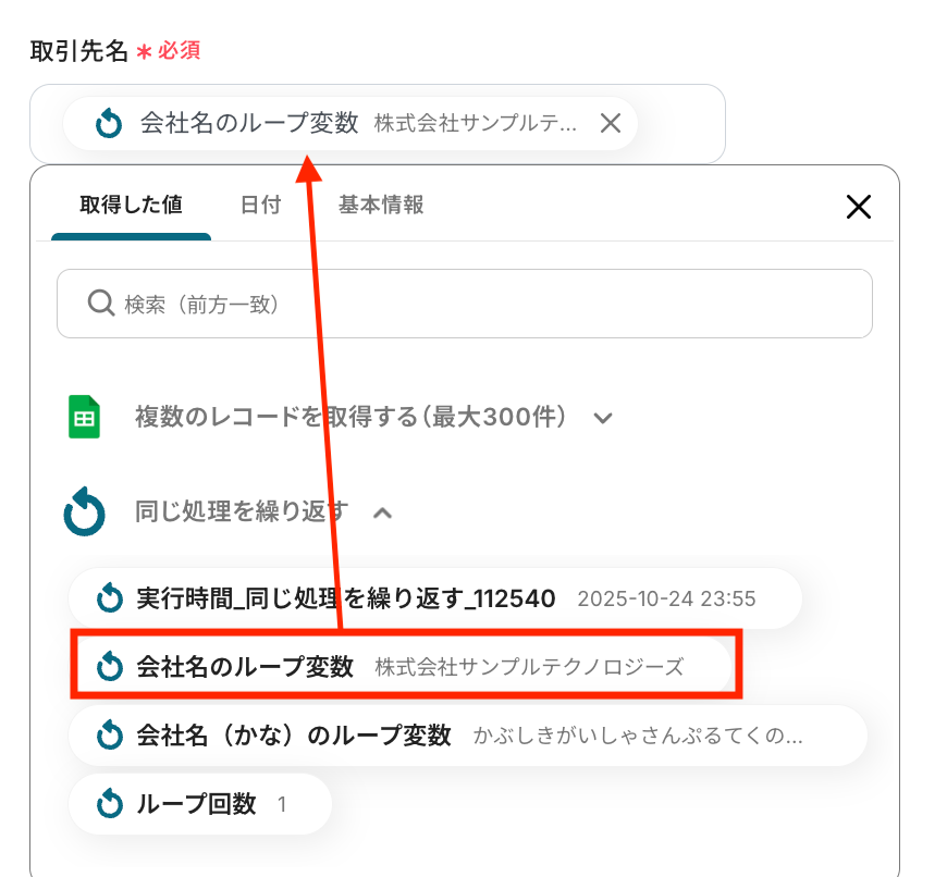 「取引先名」に取得した値から「会社名のループ変数」を設定します。
