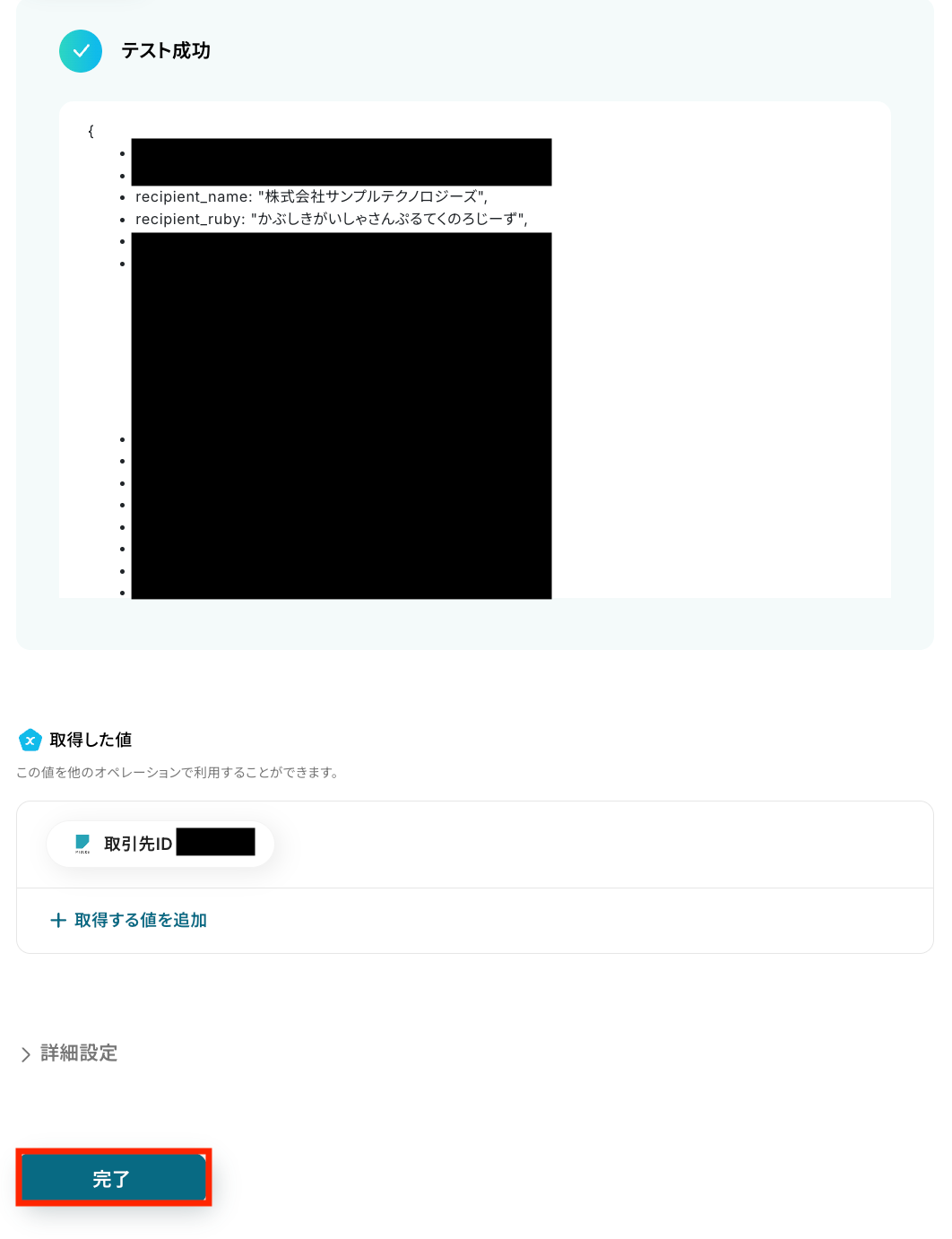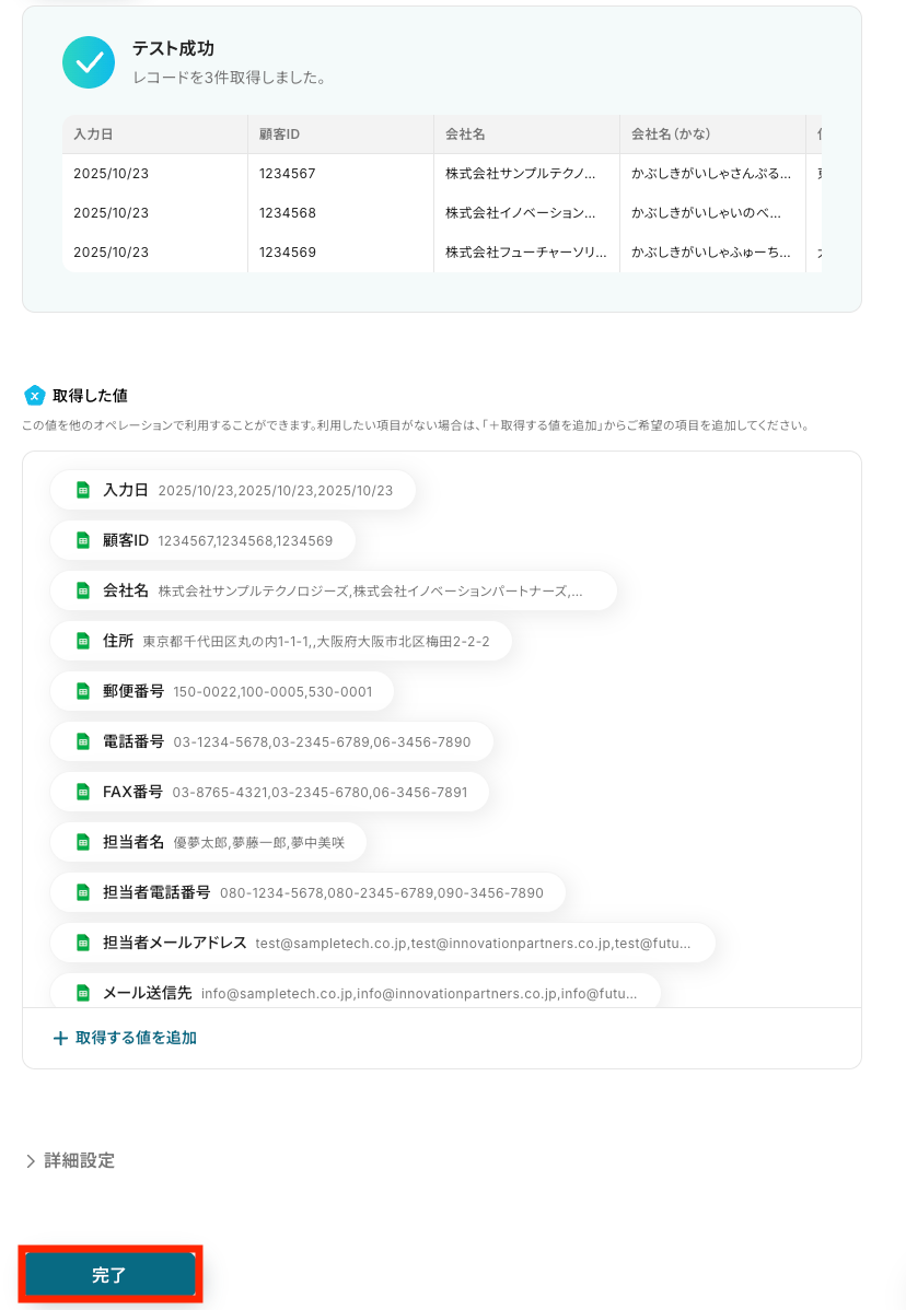 テストが成功し、会社名や連絡先などの取得した値が表示されたら「完了」をクリックします。