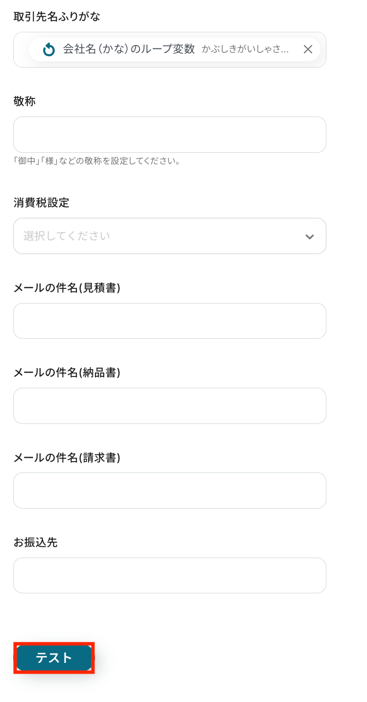 「取引先名ふりがな」も先ほど同様「会社名(かな)のループ変数」を設定し、必要なら他の項目も入力して「テスト」をクリックします。