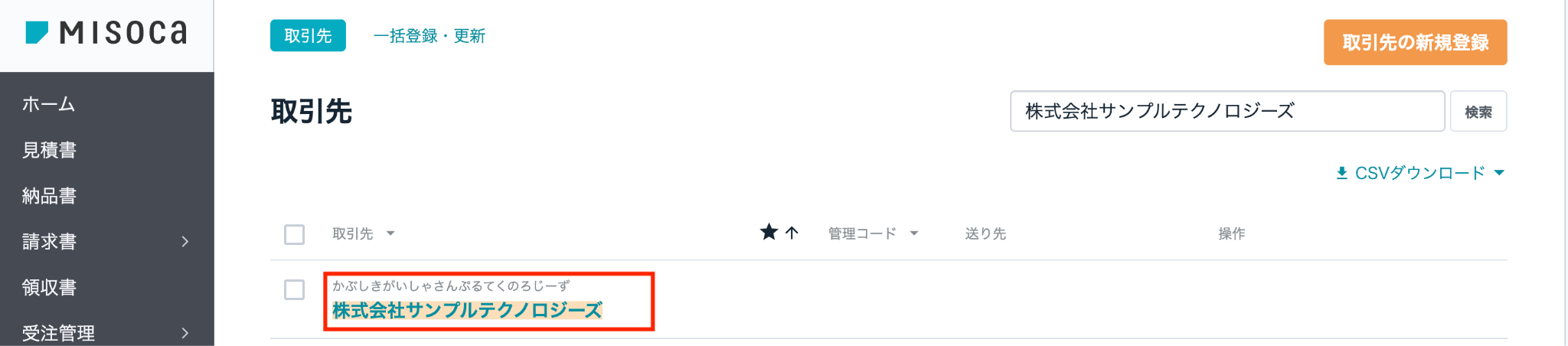 Misocaの取引先一覧で作成された取引先が表示されることを確認します。