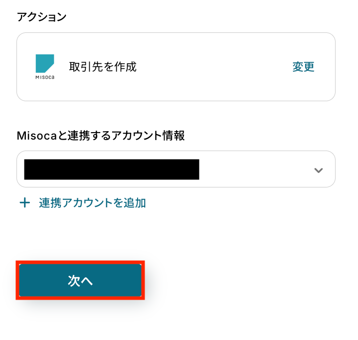 Misocaの連携アカウントを選び「次へ」をクリックします。