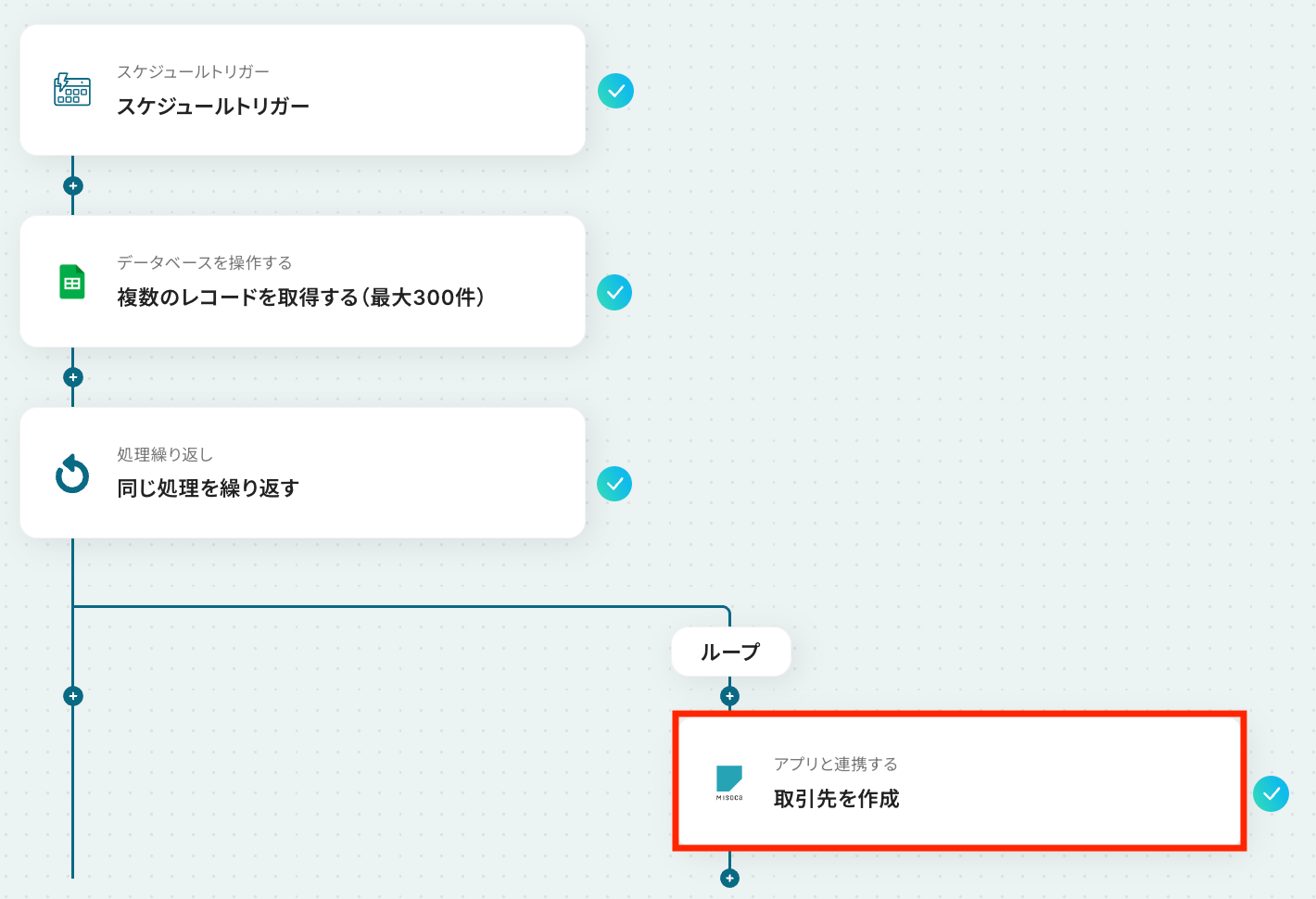 kintoneでレコードが登録されたら、Misocaに取引先を作成するフローです。