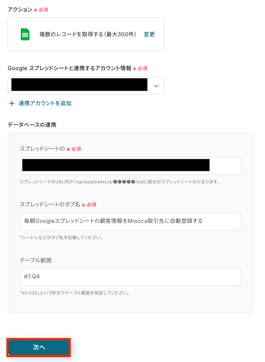 連携アカウント、スプレッドシートID、タブ名、テーブル範囲をGoogle スプレッドシートに合わせて入力し「次へ」をクリックします。