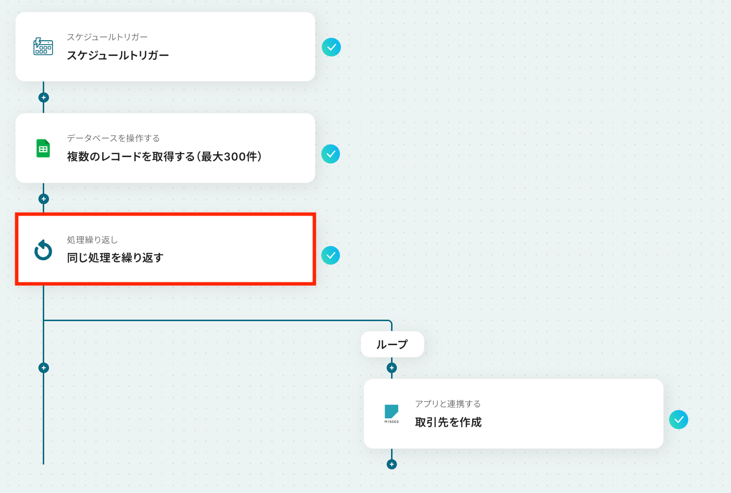 ※「同じ処理を繰り返す」オペレーションを使う場合は、チームプランまたはサクセスプランが必要です。フリープラン・ミニプランだと、そのオペレーションやデータコネクトを設定してもエラーになってしまうのでご注意ください。