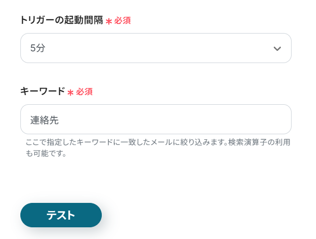 - トリガーアクション:Gmailで特定のキーワードに一致するメールを受信したら起動します。