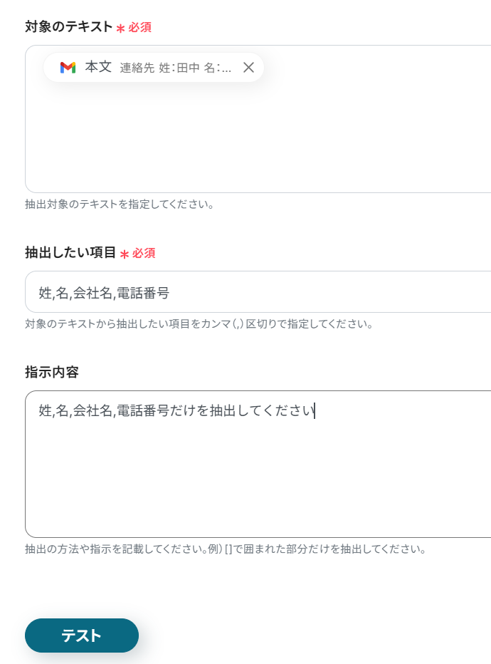 抽出したい項目と任意の指示内容を入力し、「テスト」をクリックしてください。