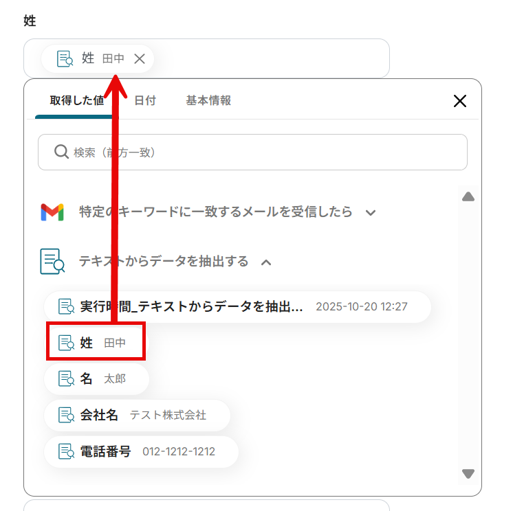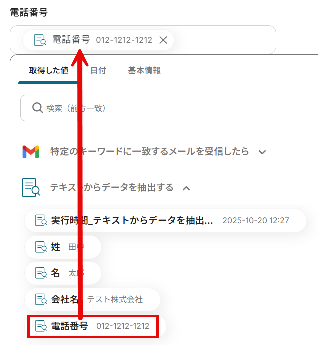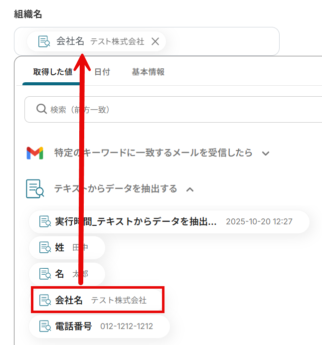 「姓」「電話番号」「組織名」も同様に前項で取得した値から選択します。