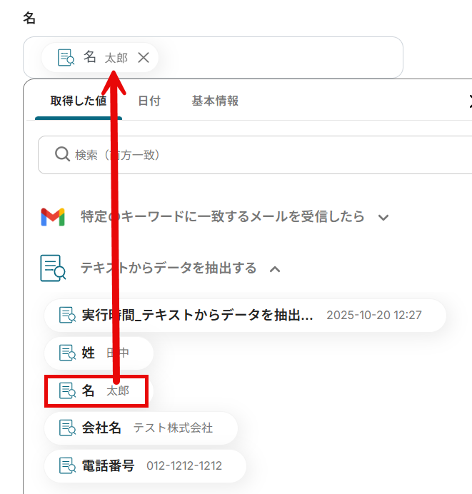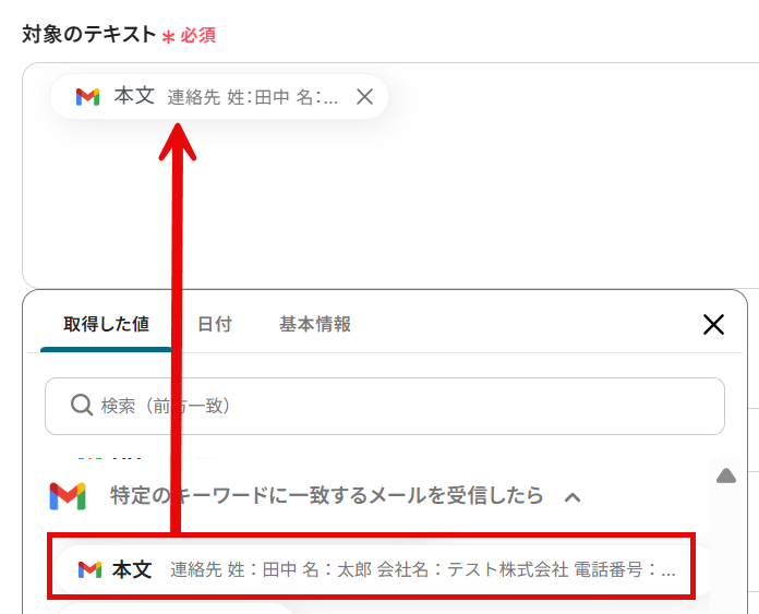 対象のテキストには、前項で取得した値から「本文」を選択してください。