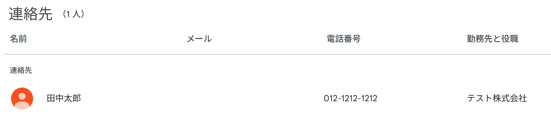 テストに成功すると、以下のように表示され、Googleコンタクトには連絡先が作成されていますね!