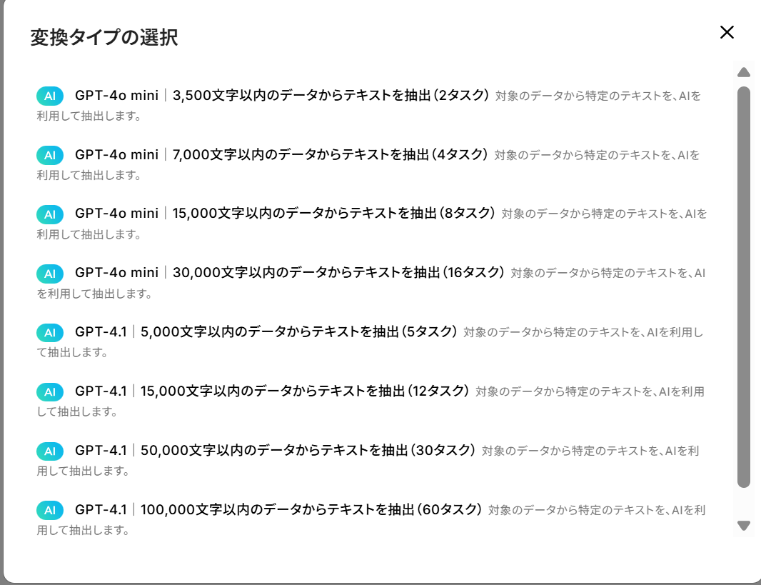 - 変換タイプ:使用するAIと文字数によって消費するタスク数が異なります。