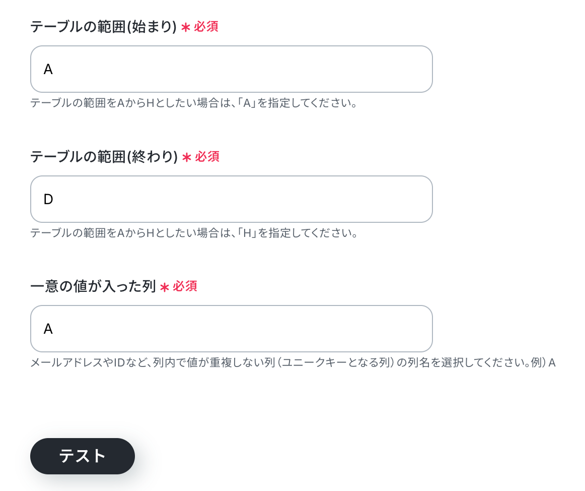 たとえば、AからD列のデータを取得したい時は「A」を指定します。