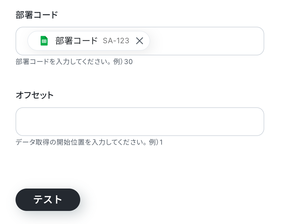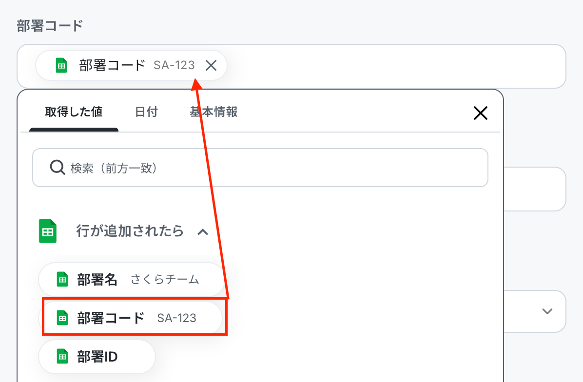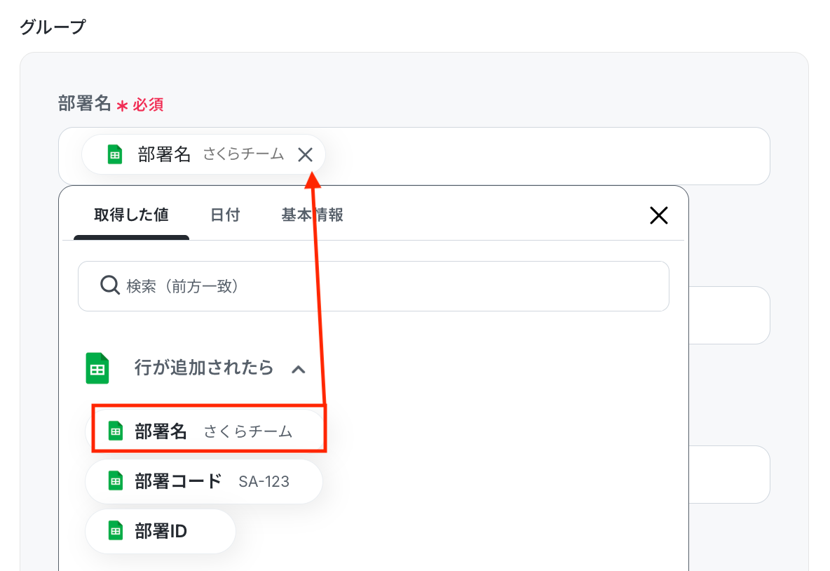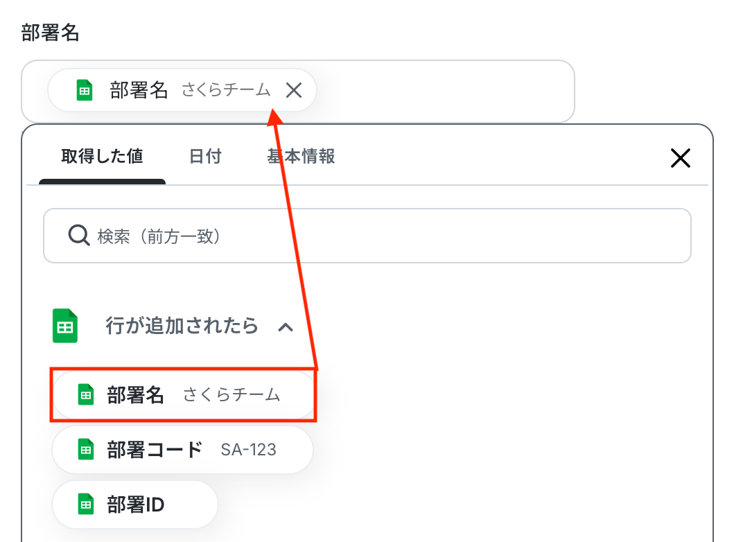 入力欄をクリックすると、前のステップでGoogle スプレッドシートから取得した値が表示されるので、選択して入力しましょう。